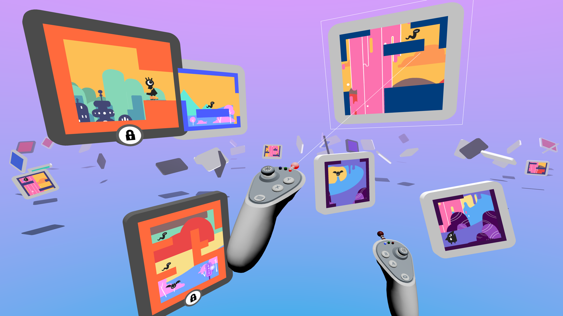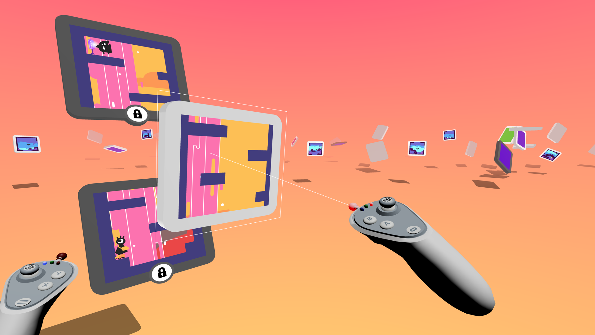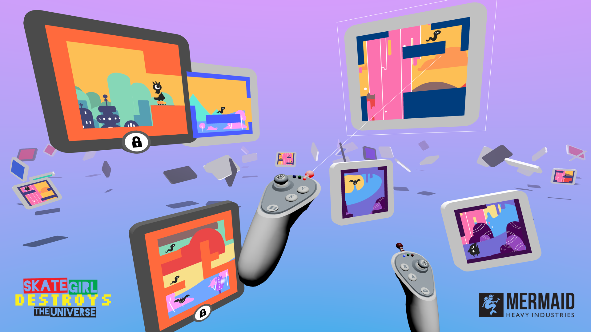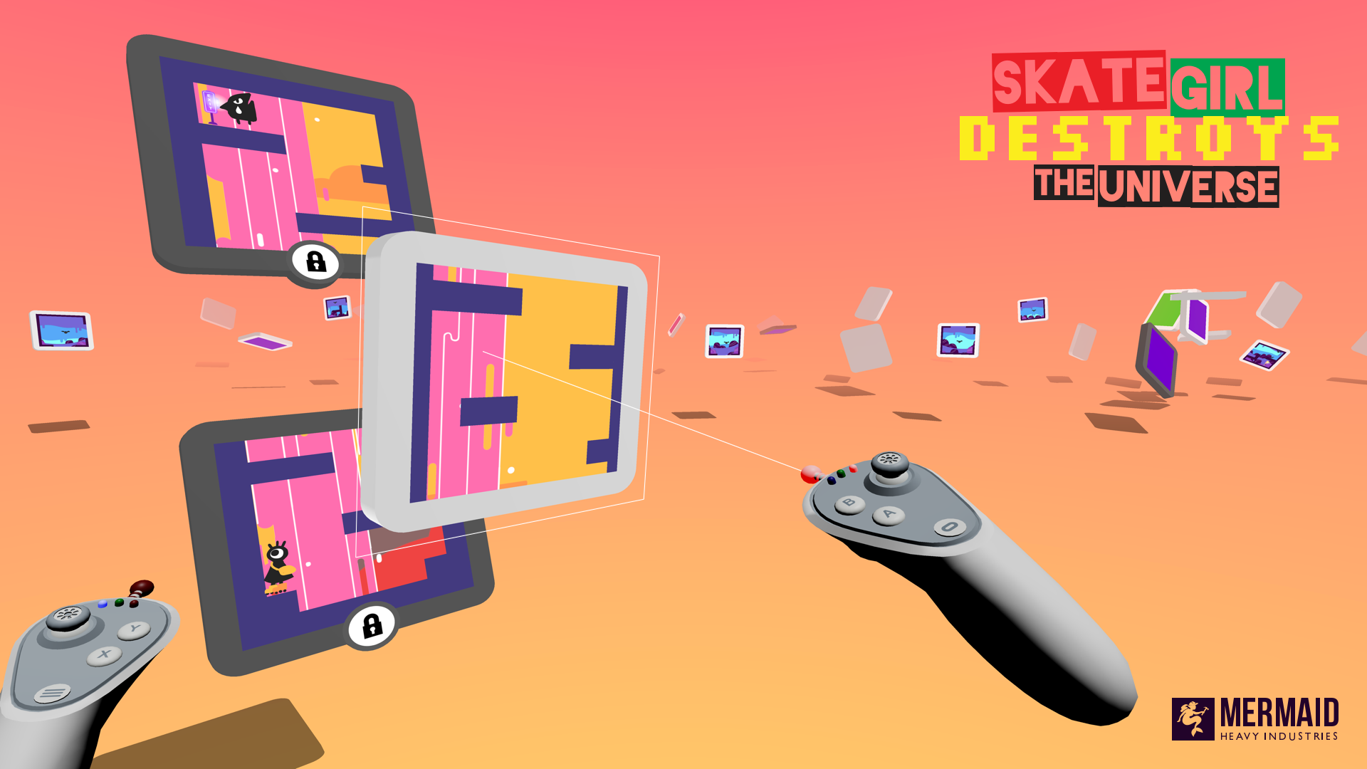 SKATEGIRL DESTROYS THE UNIVERSE is a game played on TV screens floating in a surreal 3D VR space. On the screens the player controls Skategirl, who just destroyed the universe. The player in VR must grab, move and fit together the TV screens like jigsaw pieces to create a path Skategirl can move through to escape the horrible, horrible consequences of her own actions. But like, in a fun way.